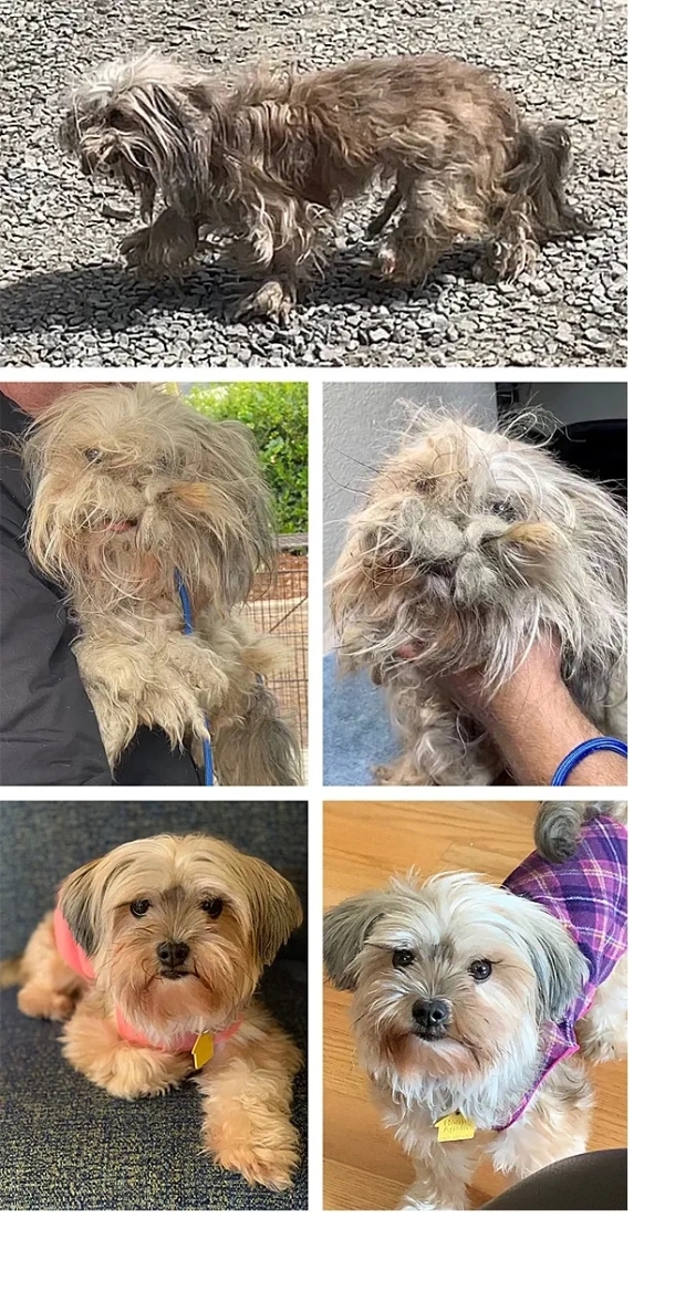Terrified and severely matted, this little dog was found running in the rural back roads of San Bernardino.